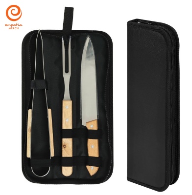 - Incluye 1 pinza, 1 cuchillo, 1 tenedor trinchante y su estuche de poliéster.